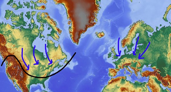 Auch wenn man sich das Herkunftsgebiet anschaut: Der Ursprung der nordamerikanischen Kaltluft hat wesentlich größere Anteile an Festland und zugefrorenem Binnenmeer, wo sich über Wochen hinweg dauerhafte Kaltluftreservoire aufbauen können, während das Ursprungsgebiet für Mitteleuropa wesentlich höheren Meeranteil (Nordsee und norwegische See bis Barentsee) umfasst, also tendenziell etwas weniger kalte Luftmassen, die erst in Ruhelage (unter Hochdruckeinfluss) über dem Kontinent richtig abkühlen können.