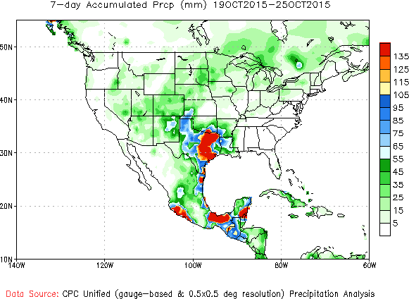 Der wetterbestimmende Rest von PATRICIA zieht jetzt allerdings nach Osten ab, dann folgt eine kurze Verschnaufpause, ehe am Wochenende das nächste, allerdings außertropische Tiefdruckgebiet neuerlich für heftige Regenfälle in Texas und angrenzende Regionen sorgt.