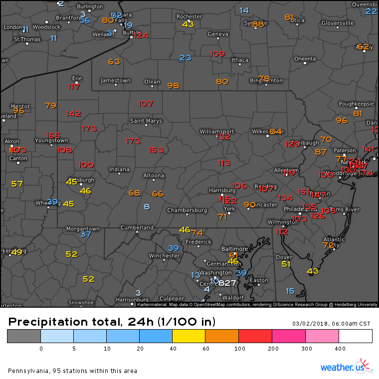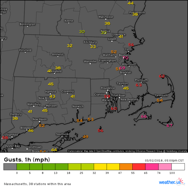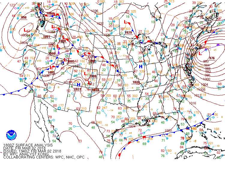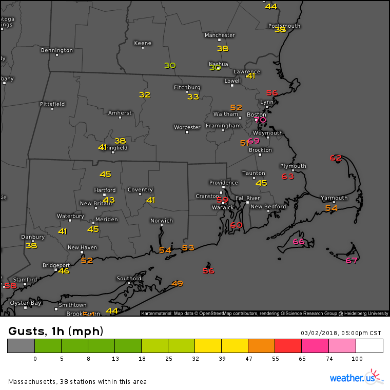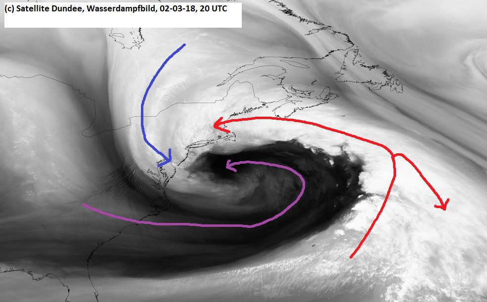 Die heftigsten Auswirkungen an der US-Ostküste waren ab 02. März, 06.00 CST (12 UTC) bis 03. März spürbar, mit Nordwind in Orkanstärke und intensiven Niederschlägen – ein klassischer Nor’Easter mit Einströmen kalter Luft von Kanada, und gleichzeitigem Aufgleiten aus Südosten. Dieses brachte in den Küstenregionen ergiebige Niederschläge: