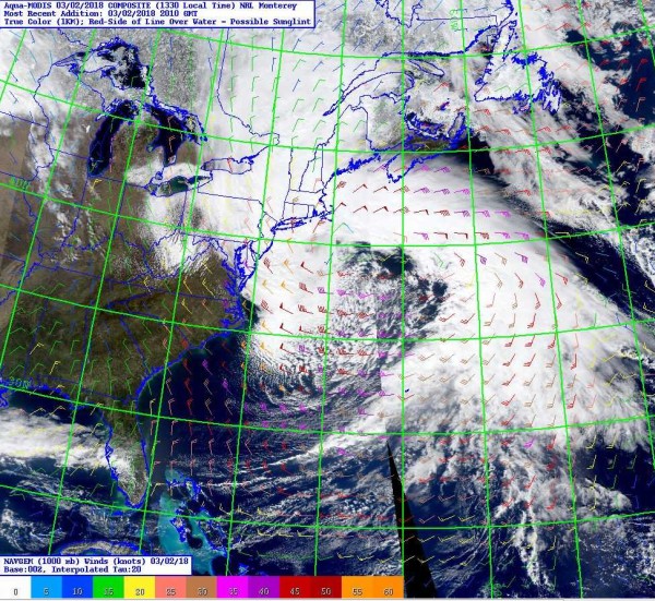 Hochaufgelöstes Satellitenbild (1km), inklusive Bodenwind (1000 hPa) vom US-Marine-Modell NAVGEM vom 02. März 2018, 20.10 UTC