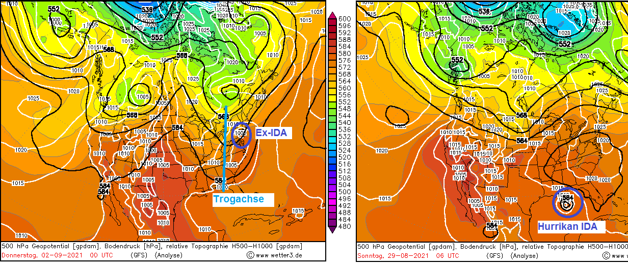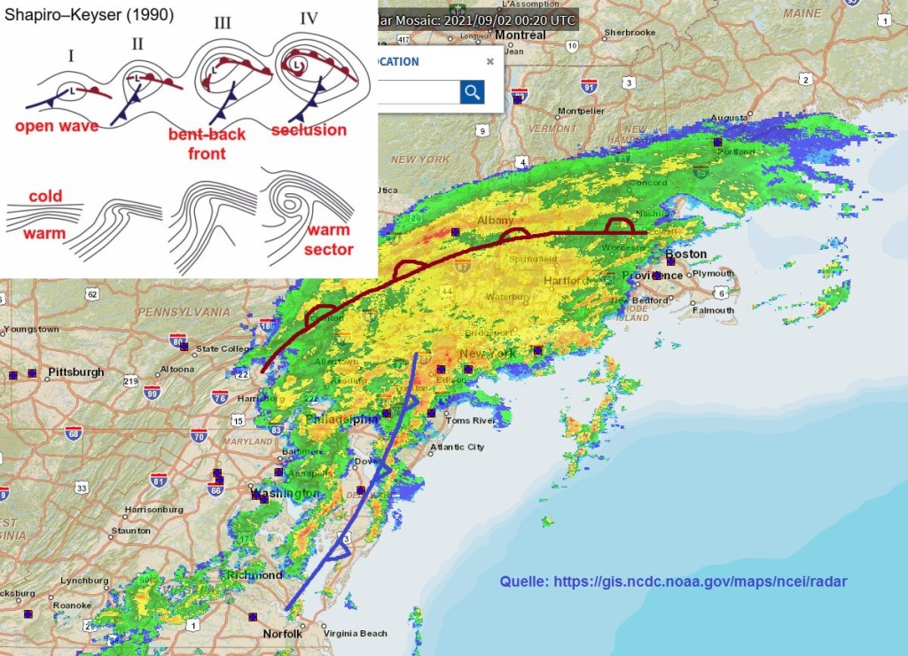 Ich störe mich hier an zwei Formulierungen: 1. war IDA zum Zeitpunkt des Starkregens kein Hurrikan mehr. Laut Archiv des NHC (National Hurricane Center) in Miama wurde das Tief als „Remnants of IDA“ tituliert, also Reste des Tropensturms. Die letzte Ausgabe war am Donnerstag, 02. September 2021 um 5 Uhr AM EDT (Eastern Time, 6 Stunden vor unserer Sommerzeit, also Mittwoch, 23 Uhr MESZ). 2. könnte man jetzt diskutieren, ob die Übersee-Redakteure aus „Remnants“ Ausläufer gemacht haben. Ausläufer ist kein meteorologischer Fachbegriff – meistens sind damit Fronten gemeint. Tropenstürme haben allerdings keine Fronten im engeren Sinn (von inner und outer eyewall abgesehen). Der Begriff „remnants of a tropical storm“ beschreibt meist einen Tropensturm, der sich in Auflösung oder im Übergang in ein extratropisches Tief befindet.