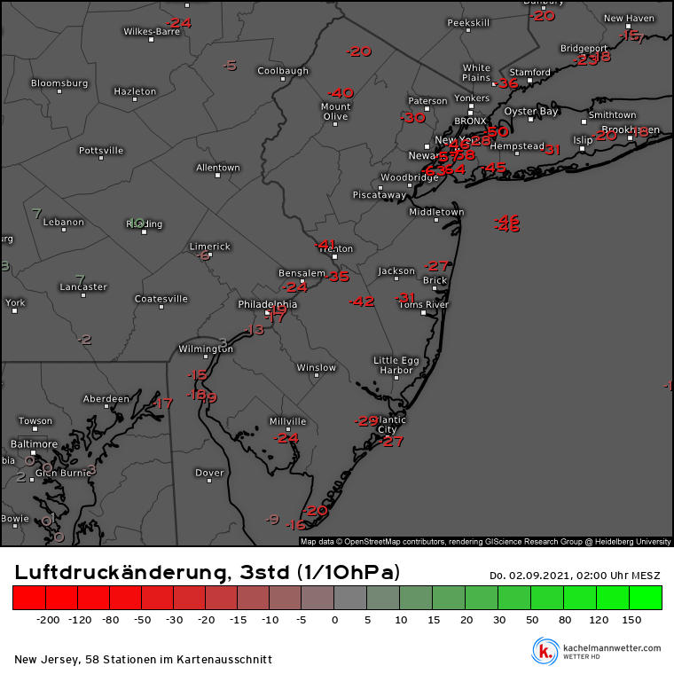 Luftdruckänderung über 3 Stunden („isallobarische Druckänderung“) im Großraum New York, 2 Uhr MESZ (links) und 6 Uhr MESZ (rechts), Quelle: kachelmannwetter.com