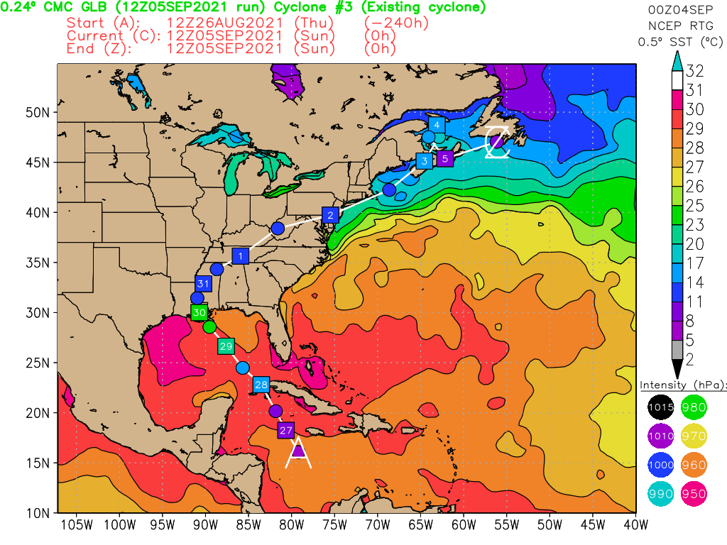 Verlauf von IDA von der Entstehung im Atlantik über den Landfall bei New Orleans, die Auflösung über dem Osten der USA bis zur Umwandlung im Nordatlantik (Quelle)