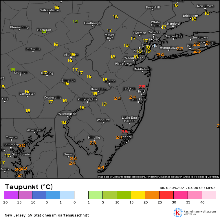 Noch deutlicher wird der frontogenetisch geprägte Niederschlag in der Verteilung der Taupunkte. Hier gibt es von Südwest nach Nordost einen klaren Feuchte-Gradienten von präfrontal (Südströmung) 22 bis 25°C und postfrontal (Nordströmung) 14-19°C. Die Luft wurde mit Frontpassage also deutlich trockener – was für die Passage eines Hurrikans nicht erwartbar wäre.
