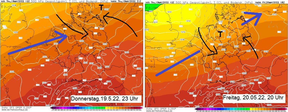 Die Prognosen sind eingetroffen, es gab an beiden Tagen schwere Unwetter in weiten Teilen von Mitteleuropa. Über den Donnerstag, 19.05.22, hatte ich bereits kurz berichtet und einen Ausblick für den Freitag gegeben. Ein starkes Bodentief in einer hochsommerlichen Luftmasse: Tornados waren vorprogrammiert. Laut Europäischer Unwetterdatenbank (ESWD.eu) wurden mindestens fünf Tornados registriert, wobei vier Tornadofälle in einer Zugbahn lagen, es könnte also auch ein einzelner, langlebiger Tornado gewesen sein. Seine stärkste Intensität erreichte er beim Durchqueren der Stadt Paderborn. Dabei gab es mindestens 43 Verletzte, 13 davon schwer (Stand 22.05.22). Die Unwetterlage selbst ist eingetroffen wie vorhergesagt, aber in den Details gab es große Abweichungen von den Lokalmodellen: Ursprünglich hätte die Squall line über Norddeutschland ostwärts ziehen sollen, tatsächlich ist nördlich von Berlin keine Blitzaktivität mehr registriert worden. Stattdessen lag der Ursprung der Böenlinie über Süddeutschland gegen 17.30 MESZ. Von dort breiteten sich die Gewitter explosionsartig nach Osten über Bayern, Sachsen, Tschechien und knapp dem Norden von Österreich aus. In Pilsen wurde 126 km/h gemessen, in Prag 115 km/h. Insgesamt haben nur wenige deutsche Stationen Böen über 100 km/h registriert. Selbst über 75 km/h sind nicht flächendeckend aufgetreten. Die Bezeichnung „Sturmtief“ für das Bodentief ist also übertrieben, da der Hintergrundwind weit schwächer war als lokale Böen in Verbindung mit Superzellen und mehreren Gewitterlinien.