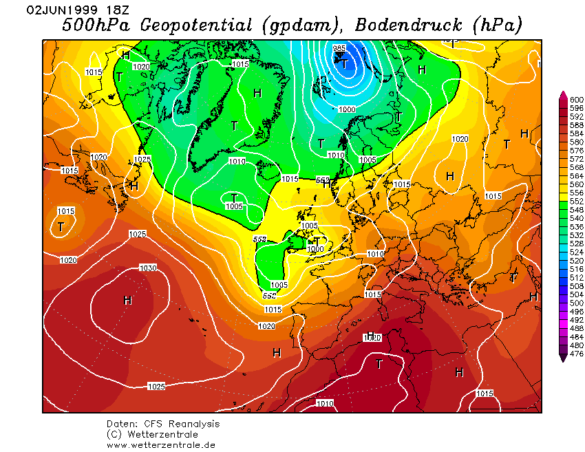 Solche Konstellationen mit subtropischen Luftmassen (hohes 500 hPa Geopotential, heiße Luftmassen) passen in den Hochsommer, aber nicht in den Mai. So ausgeprägte Bodentiefs sind wiederum im Sommer sehr selten, meist entsteht nur eine flache Isobarenausbuchtung, der sogenannte Gewittersack. An eine derartige Lage Mitte Mai kann ich mich nicht erinnern in den letzten 20 Jahren, wohl aber an den 2. Juni 1999: