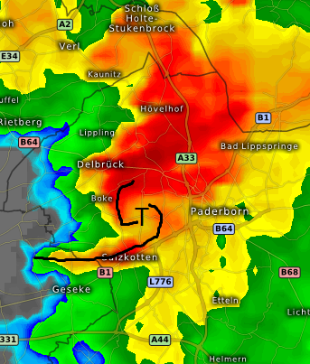 Eine lehrbuchhafte Dipolstruktur am Ort des Tornados, die auf starke Rotation hinweist. Im Radarbild erkennt man ansatzweise die Hakenstruktur der Superzelle sowie eine flanking line südlich davon. Auch aus den Videos von Lippstadt geht hervor, dass der Tornado „rain-wrapped“, also von einem Regenvorhang umhüllt war. Das macht ihn besonders tückisch, weil er nicht gut sichbar ist.