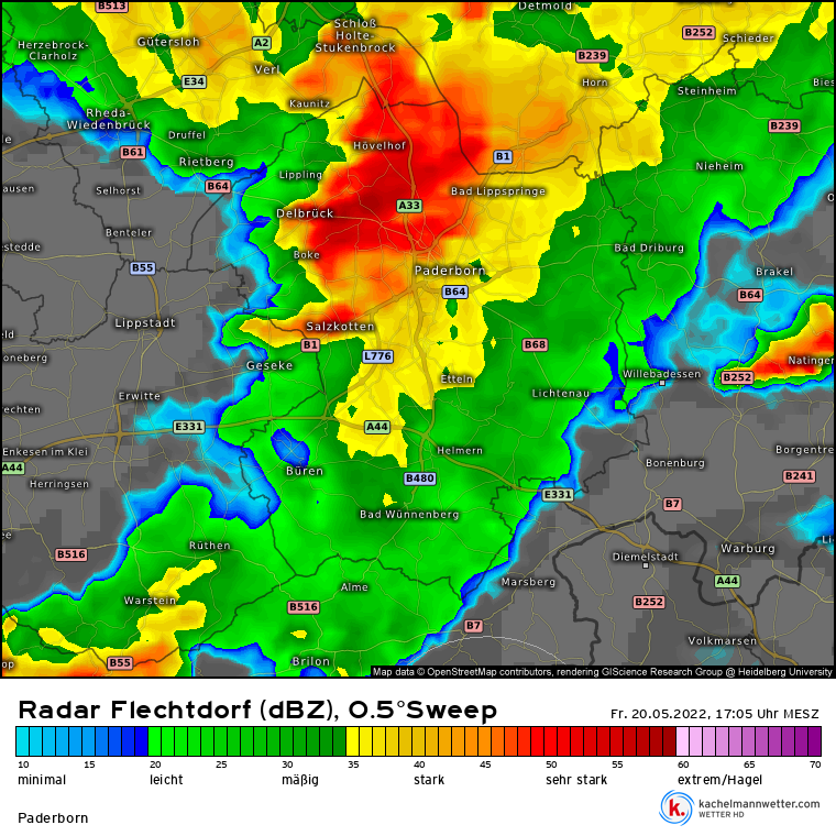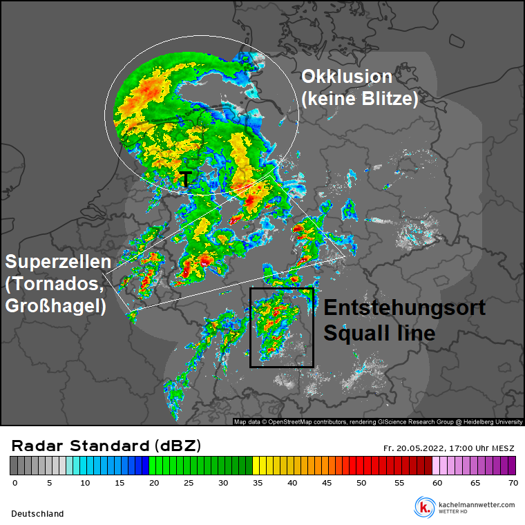 Die Prognosen sind eingetroffen, es gab an beiden Tagen schwere Unwetter in weiten Teilen von Mitteleuropa. Über den Donnerstag, 19.05.22, hatte ich bereits kurz berichtet und einen Ausblick für den Freitag gegeben. Ein starkes Bodentief in einer hochsommerlichen Luftmasse: Tornados waren vorprogrammiert. Laut Europäischer Unwetterdatenbank (ESWD.eu) wurden mindestens fünf Tornados registriert, wobei vier Tornadofälle in einer Zugbahn lagen, es könnte also auch ein einzelner, langlebiger Tornado gewesen sein. Seine stärkste Intensität erreichte er beim Durchqueren der Stadt Paderborn. Dabei gab es mindestens 43 Verletzte, 13 davon schwer (Stand 22.05.22). Die Unwetterlage selbst ist eingetroffen wie vorhergesagt, aber in den Details gab es große Abweichungen von den Lokalmodellen: Ursprünglich hätte die Squall line über Norddeutschland ostwärts ziehen sollen, tatsächlich ist nördlich von Berlin keine Blitzaktivität mehr registriert worden. Stattdessen lag der Ursprung der Böenlinie über Süddeutschland gegen 17.30 MESZ. Von dort breiteten sich die Gewitter explosionsartig nach Osten über Bayern, Sachsen, Tschechien und knapp dem Norden von Österreich aus. In Pilsen wurde 126 km/h gemessen, in Prag 115 km/h. Insgesamt haben nur wenige deutsche Stationen Böen über 100 km/h registriert. Selbst über 75 km/h sind nicht flächendeckend aufgetreten. Die Bezeichnung „Sturmtief“ für das Bodentief ist also übertrieben, da der Hintergrundwind weit schwächer war als lokale Böen in Verbindung mit Superzellen und mehreren Gewitterlinien.