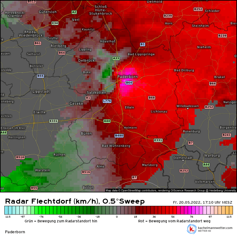 Tornado Paderborn im Radar Flechtdorf, 17.10 MESZ, Doppler-Geschwindigkeit und zugehörige Radarreflektivität (17.05 MESZ)