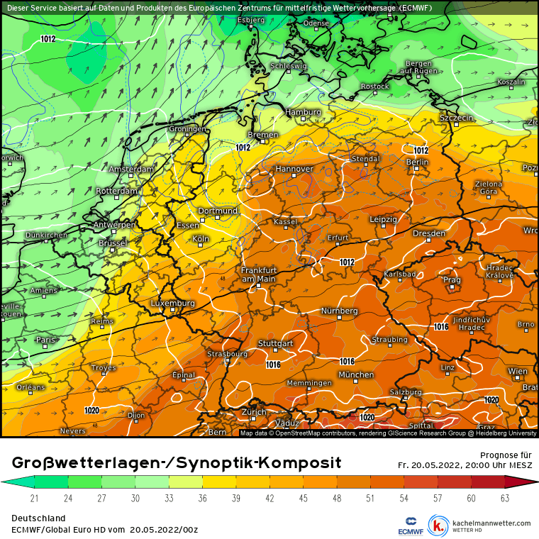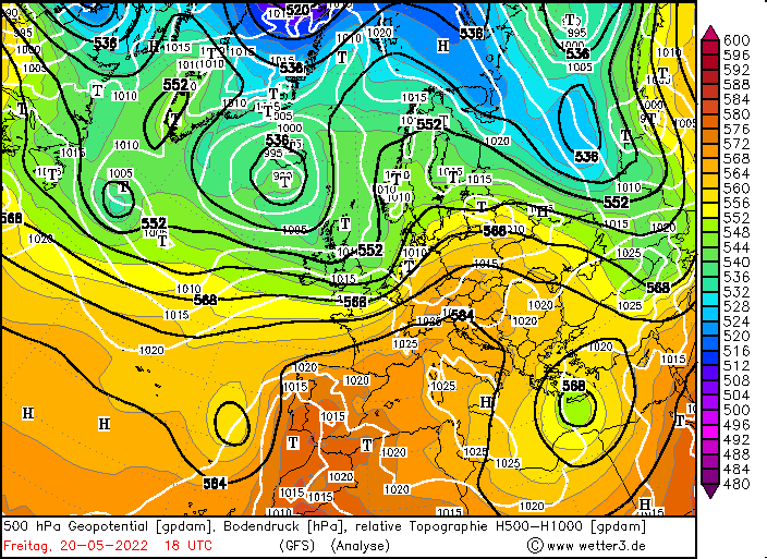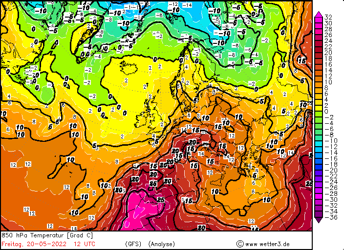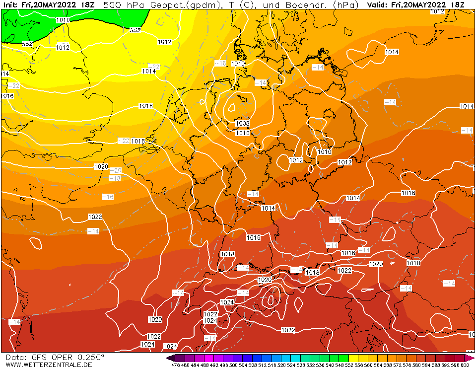 Der Wochenausklang war geprägt von einem mächtigen Höhenrücken von Nordafrika über den westlichen Mittelmeerraum bis zu den Alpen. Vorderseitig eines Troges über dem Nordatlantik wurde subtropisch warme Luft über die Iberische Halbinsel und Frankreich bis nach Mitteleuropa geführt. Verbreitet kam es zu Temperaturrekorden für Mai, für Frankreich war es der 39. Tag in Folge mit weit überdurchschnittlichen Höchstwerten. In die straffe Südwestströmung eingebettet waren zwei ausgeprägte Kurzwellentröge. Der erste führte am Donnerstag zu einem stärkeren Bodentief und brachte eine ausgedehnte Squall line über Norddeutschland. Das zweite, bereits seit Tagen stärker gerechnete Bodentief zog am Freitag über Benelux und Norddeutschland zur Ostsee und leitete den Luftmassenwechsel ein.