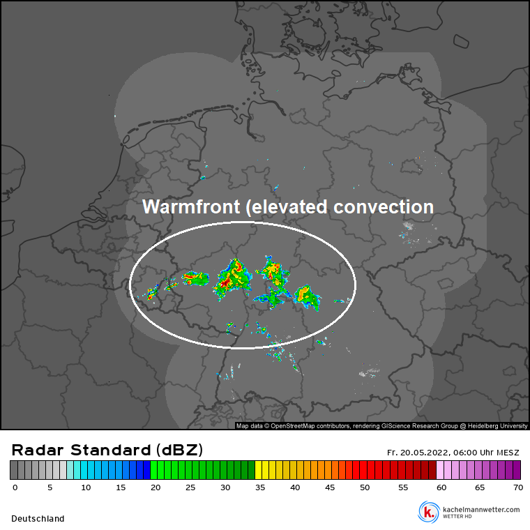 Die ersten Gewitter am frühen Freitagmorgen zogen über die südlichen Mittelgebirge ostwärts. Sie entstanden entlang der Warmfront des breiten Bodentiefs über Nordwestfrankreich auf der warmen Seite. Gewitter so früh am Morgen sind unabhängig der Einstrahlung, sie entstehen „elevated“, also entkoppelt vom Boden. Vom zuständigen ESTOFEX-Vorhersager wurde diese Konvektion bereits als gefährlich im Sinne von Großhagelpotential eingestuft.