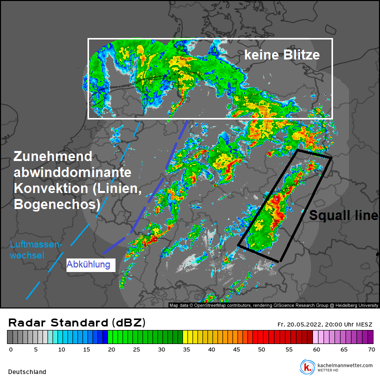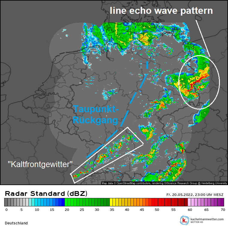 Nun wirds spannend und komplex. Die Superzellenaktivität nimmt am Abend ab, rückseitig intensiviert sich die barokline Zone, das Bodentief verstärkte sich. Die Kaltfront kam in zwei Staffeln, mit einer markanten Abkühlung, an dessen Vorderkante die Gewitter erhalten blieben, und dem eigentlichen Luftmassenwechsel, mit dem auch die Taupunkte deutlich zurückgingen. Auch die Gewitterechos über Rheinland-Pflanz, Thüringen zeigen zunehmend lineare Strukturen, d.h. die Abwinde wurden dominant, das Ausströmen stärker. Starkwinde (ohne Tornados) wurden das größte Risiko noch vor Großhagel und Starkregen.