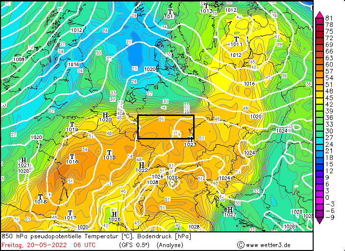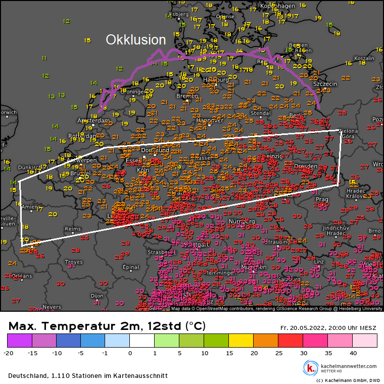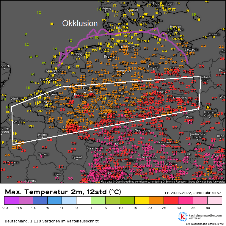 Je niedriger (rötlicher) die Wolkenobergrenzentemperatur, desto stärker der Auftrieb und die Konvektion. Überschießende Gewitterwolken durchstoßen die Tropopause und kommen in die wärmere Stratosphäre, daher gibt es manchmal wärmere Zonen umgeben von kälteren („cold-ring shape, V shape“). Auch hier werden alle drei Zonen sichtbar. Die deutlich niedrigere Wolkenbildung über Norddeutschland, die einzelnen Cluster mit den Superzellen über der Mitte und das riesige mesoskalige konvektive System über Polen und Tschechien bis Österreich mit den niedrigsten Obergrenzentemperaturen.