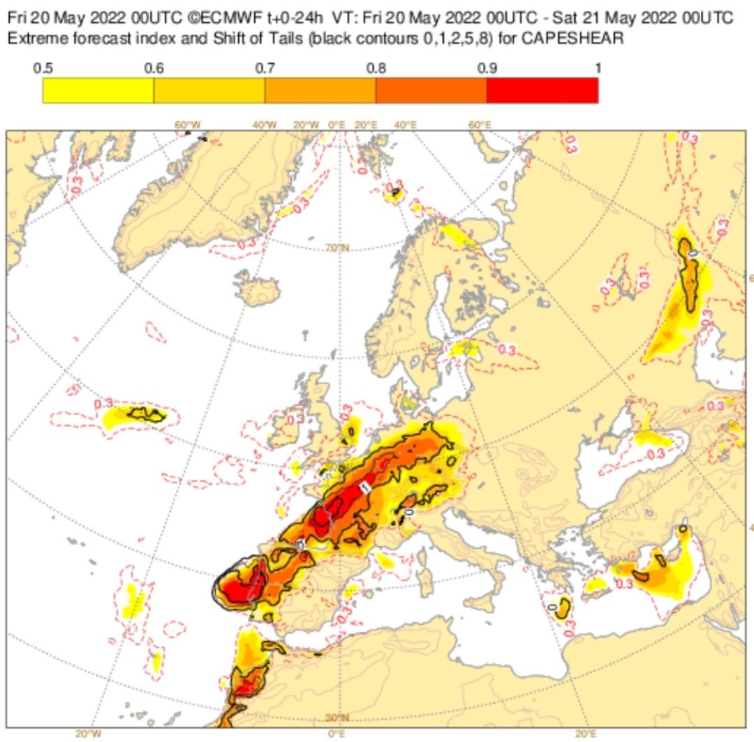 Der EFI zeigt die Wahrscheinlichkeit für Ereignisse, die von der Modellklimatologie abweichen. 1 heißt so viel wie „noch nie dagewesen“. Das zeigt für Nordfrankreich bis Nordrhein-Westfalen verbreitet eine 1 für das Produkt aus CAPE-Scherung. Wenn sich beide Faktoren überlappen und tiefbasige Konvektion entsteht, besteht das höchste Potential für Tornados.