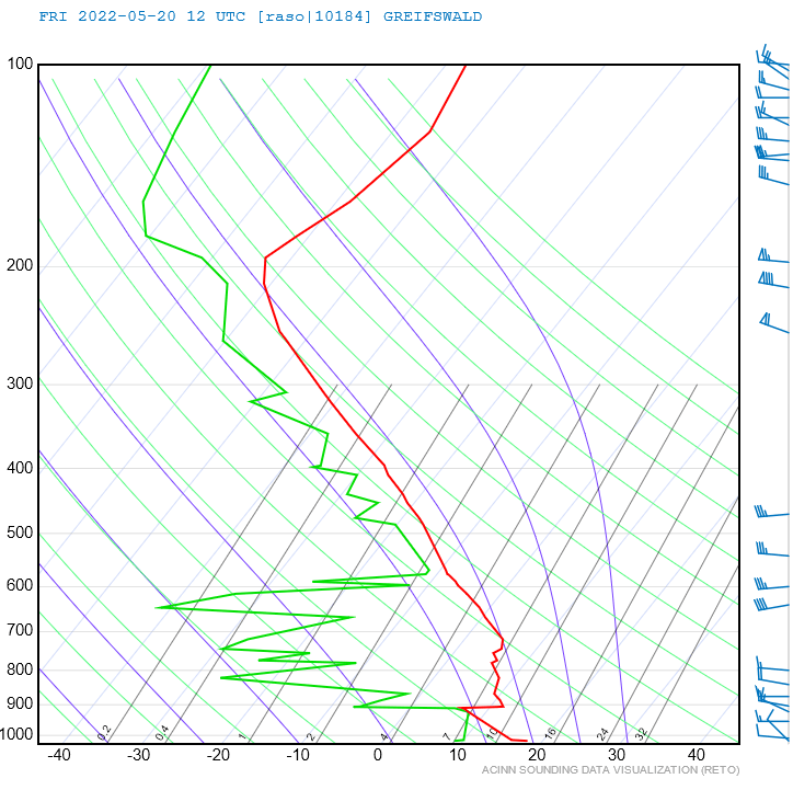 Im 14 Uhr MESZ-Aufstieg (links) ist ein „warmer Bauch“ zwischen 800 und 600 hPa zu erkennen, unten ist es generell trocken und oben sehr feucht (frontal, Okklusion). Keine Labilität vorhanden. Im 20 Uhr MESZ-Aufstieg (rechts) wurde die warme Shicht zwar abgebaut, aber in etwa 850 hPa ist es noch etwas wärmer geworden und die Inversion ist geblieben. Höchstens marginal Labilität vorhanden. Weiter im Nordosten sieht man die frontale Prägung noch stärker, z.B. in Greifswald im Mittagsaufstieg: