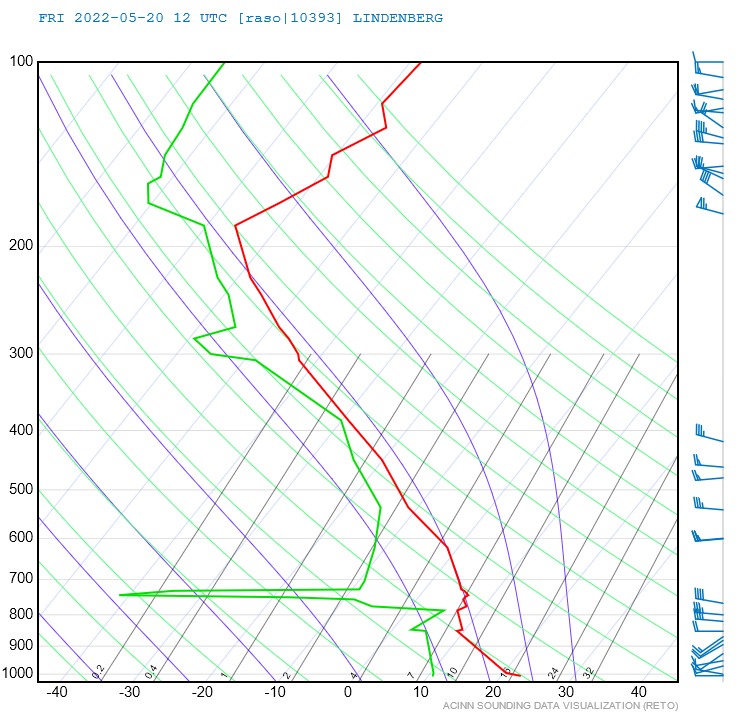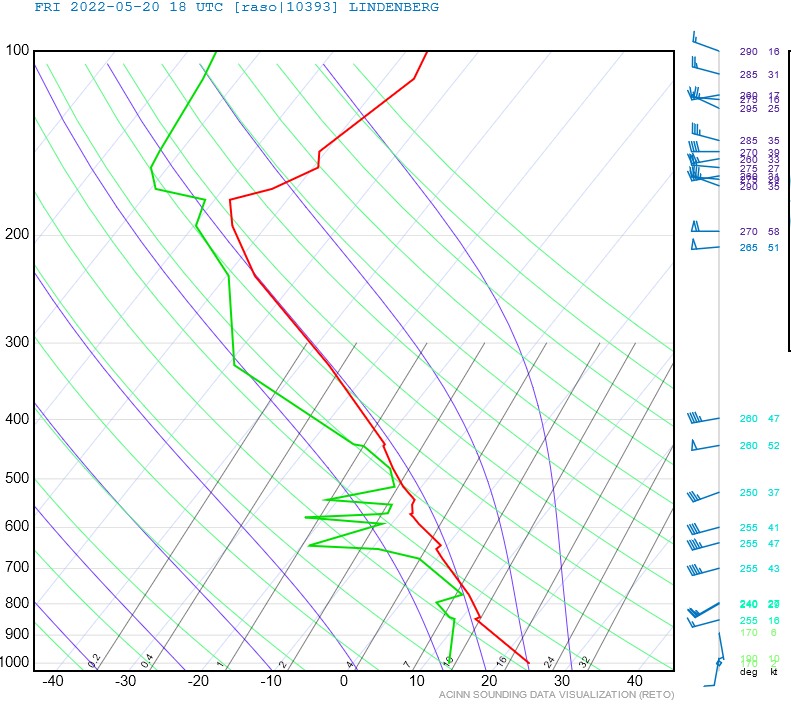 Der Aufstieg etwa drei Stunden vor den Tornados zeigt rückdrehende Bodenwinde (Südost), darüber stark aufdrehende Südwestwinde. Die notwendige Richtungs- und Geschwindigkeitsscherung für Tornados! Die Labilität war gedeckelt durch zwei Absinkinversionen, die infolge der noch zunehmenden Hebung (großräumig, Outflow Boundaries, Einstrahlung) aber abgebaut wurden. Dann konnte die Luft bis zur Tropopause aufsteigen. Die niedrigste Obergrenzentemperatur wurde mit rund -70°C gemessen.