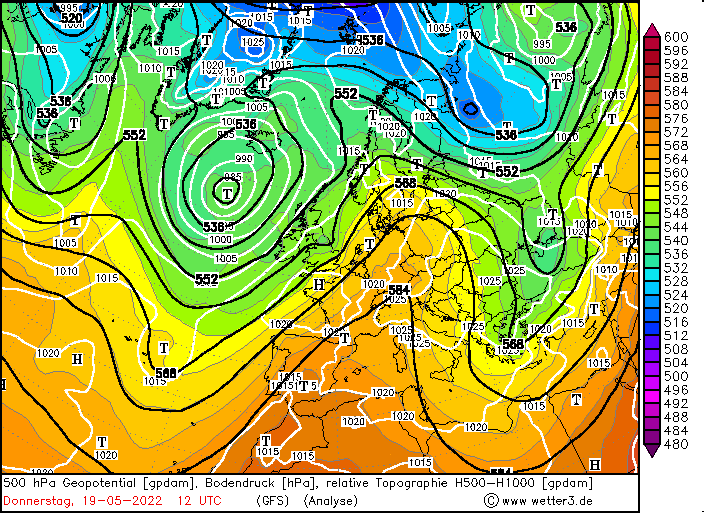 Was mich nichtsdestotrotz fasziniert, ist alleine diese Kombination aus kleinräumig starker Tiefdruckentwicklung und das zugehörig hohe Geopotential. Üblich für starke Tiefs im Frühjahr wäre ein Geopotentiel wie über Großbritannien (gelb-grün), aber nicht orange-rot, was eben die Zufuhr rekordwarmer Luftmassen aus Südwesten unterstreicht.