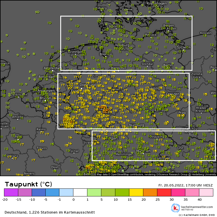 Zone 3: Süddeutschland, Tschechien und der Norden von Österreich – die heißeste Luftmasse mit verbreitet 30-34°C und Temperaturrekorden (Bludenz 33,7) und lange ungestörter Einstrahlung (wolkenlos bis wolkenarm). Hier lagen auch die Taupunkte deutlich niedriger, verbreitet unter 15°C. Damit der größte Spread und generell recht trockene Luftschichten.