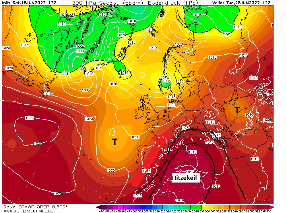 Stellvertretend nur eine Prognosekarte, hier von EZWMF für Dienstag, 28. Juni 2022, mit 500 hPa Geopotential (farbig) und Bodendruck (weiß).