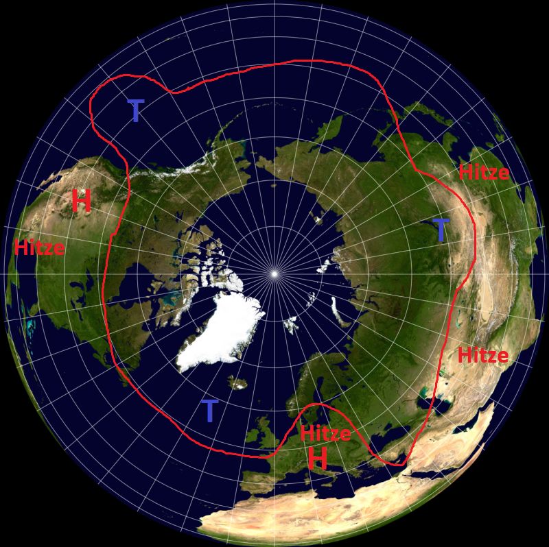 In der Grafik ist die ungefähre Lage der Rossbywellen Mitte Juli 2022 aufgetragen, als sich wieder eine von mehreren Hitzewellen in Europa ereignete. Die Rossbywellenzahl ist klein – man erkennt allenfalls zwei ausgeprägte Wellen. Die globale Zirkulation war ausgesprochen stabil.