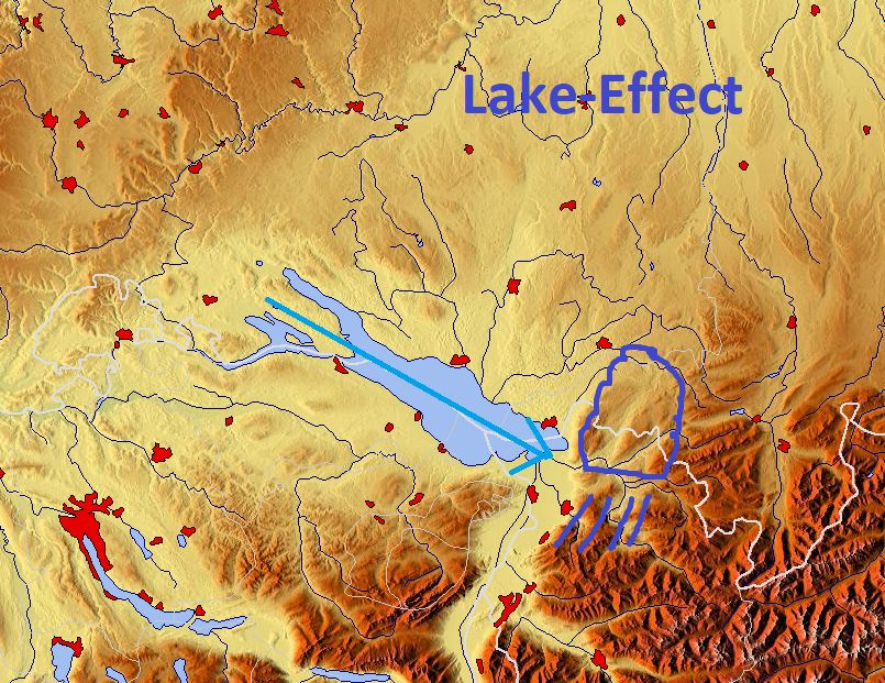Lake-Effect am Bodensee: Kalte Luft strömt über dem warmen Bodensee und nimmt viel Feuchte auf, die sich am Bregenzerwald abregnet.