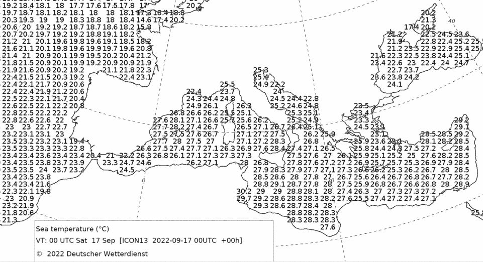 Wassertemperaturen am 17. September 00 UTC, Quelle: wetter3.de bzw. DWD
