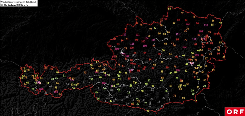 1.Verifikation: Erhebliche Sturmschäden und Verkehrsbehinderungen, 1 Todesopfer durch die Kaltfrontpassage: ORF-Meldung vom 22.12.23