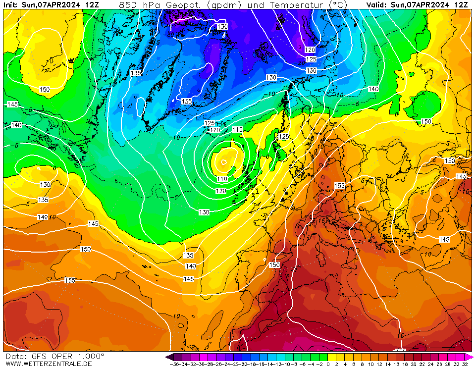 Mit Föhnunterstützung sind im Alpenraum und nördlich davon 30°C in 850 hPa durchaus vorstellbar. Das würde Höchstwerten um 45°C in den Tallagen entsprechen, bei wenig Wind durch die Überadiabate auch 47 oder 48°C. Bisher liegen wir um 41°C bei den absoluten Extremwerten in Mitteleuropa.