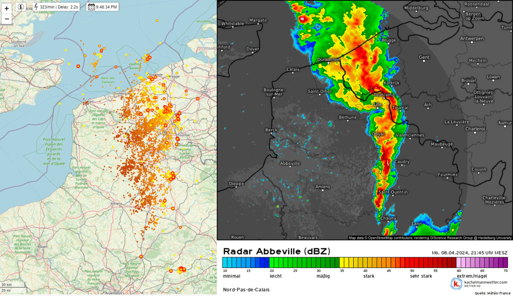 Am Abend entstand über Benelux eine markante Squall line mit LEWP-Strukture (Line Echo Wave Pattern) und mutmaßlich schweren Sturmböen, um 22 Uhr hatte es in Wien immer noch +22°C.