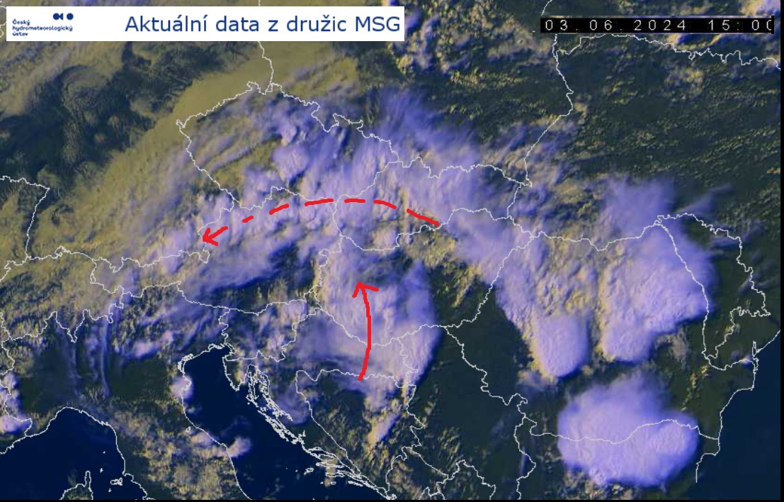 Am Freitag und Samstagvormittag war das Niederschlagsgebiet über Süddeutschland noch deutlich konvektiv durchsetzt mit den höchsten Niederschlagsraten. Zum Samstagabend hin nahmen die Raten vorübergehend ab, weil die Bewölkung zunehmend ausschichtete (stratiformer wurde). Über Polen und Tschechien war aber bereits der langgestreckte Bereich zu erkennen, in dem weitere labile Luft mit ergiebigen Gewitterniederschlägen aus Nordosten herangeführt wurde.