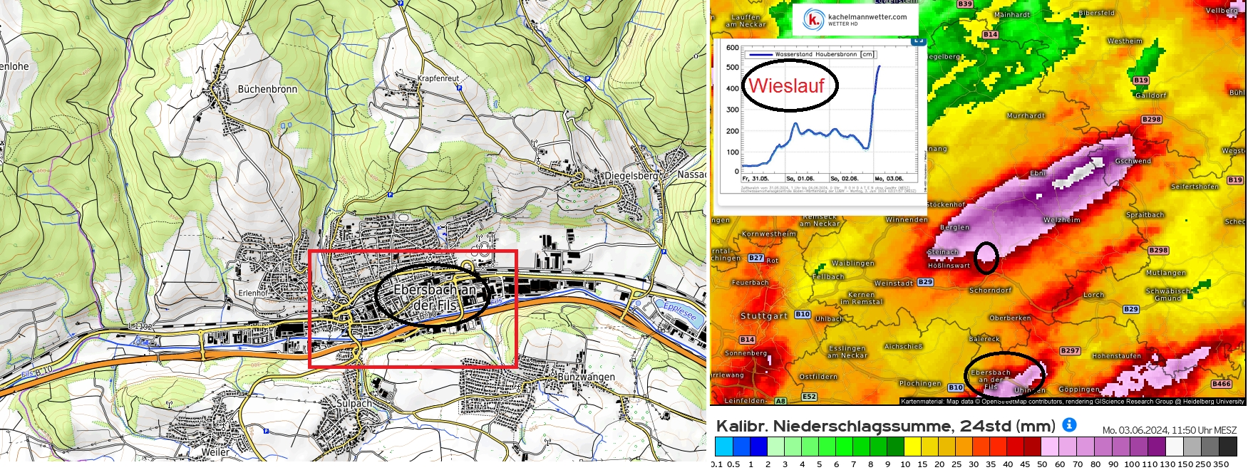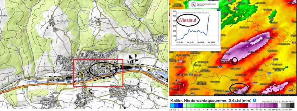 Am Sonntag, 02.06, kam es im Zuge von abendlichen Starkniederschlägen mit Spitzen um 100-150mm in wenigen Stunden auch im Einzugsgebiet des Neckars zu extremen Überflutungen, wie in Ebersbach an der Fils oder im Wieslauftal.