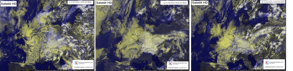 Das Satellitenbild vom Montagnachmittag zeigte die langgestreckte Okklusionsfront von Nordtirol über das nördliche Österreich bis in die Slowakei, in der etliche eingelagerte Gewitter und Starkregenschauer für die hohen Niederschlagsmengen in kurzer Zeit verantwortlich waren. Süddeutschland selbst war zum Glück kaum betroffen. Rumänien, Serbien und Bulgarien lagen in einem seltenen Level-3-Risikogebiet wegen der Gefahr von sehr großem Hagel, Orkanböen und Tornados. Dort dauerte es wegen abschattender Bewölkung länger und der Fokus lag etwas östlicher als vorhergesagt.