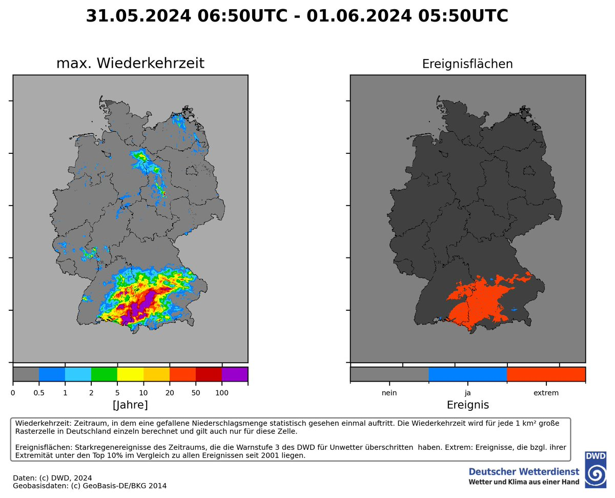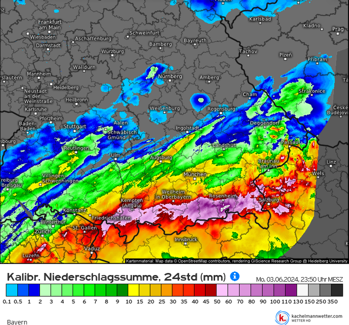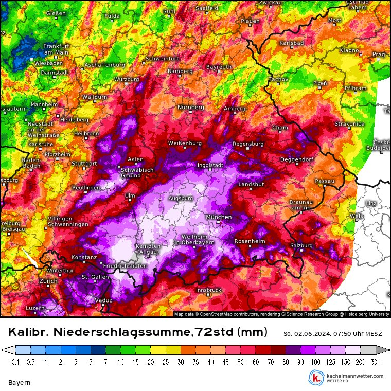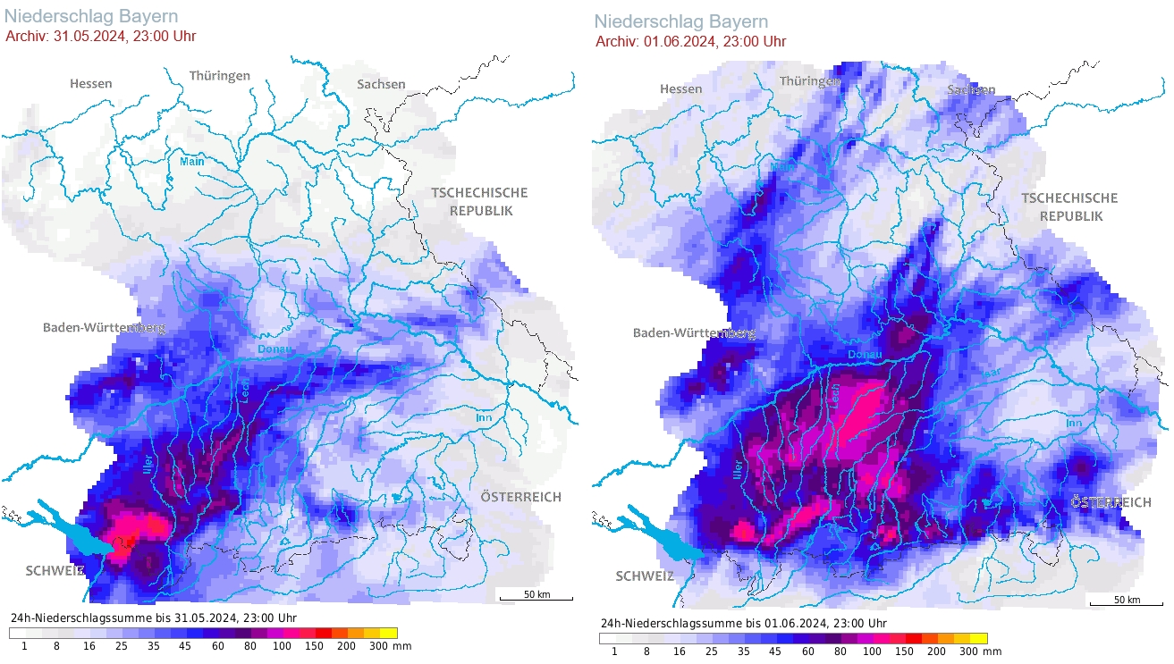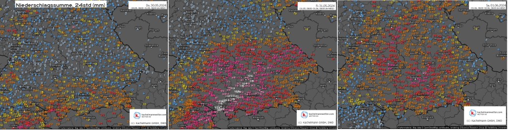 Am Donnerstag begann das Ereignis am Alpennordrand, am Freitag war der Höhepunkt mit verbreitet dreistelligen Mengen vom Bodensee über Schwaben bis Oberbayern. In Bregenz waren es in 72 Stunden stattliche 175mm, am Pfänder 228mm, verbreitet waren es 90-150mm in 48 Stunden. Die relativ niedrige Schneefallgrenze von 1400-1900m hat in Vorarlberg schlimmere Bilder verhindert, auch wenn die Leiblach östlich vom Bodensee kurzzeitig ein 100-jährliches Hochwasser erreichte. In Augsburg wird seit 1947 gemessen. Der bisherige Rekord von 71mm (10.6.1965) wurde mit 96mm am 31.05.24 deutlich überboten. Am Samstag schwächten sich die Spitzenmengen deutlich ab, dehnten sich dafür nach Nordbayern aus und blieben in den am schwersten betroffenen Gebieten in Schwaben und Oberbayern weiterhin hoch.