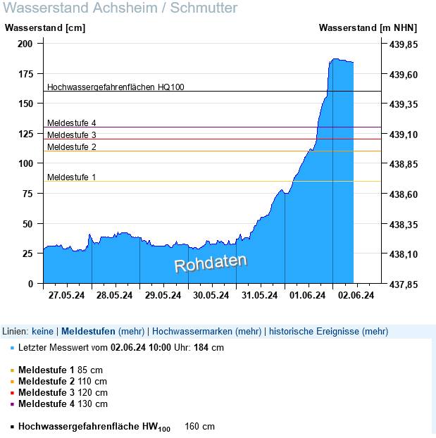 | Donauwörth | 567cm (04.06.24, 12 Uhr) | 577cm (14.04.1994) | 1310 | 1340 (14.04.1994) |