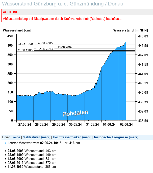 | Günzburg | 421cm (02.06.24, 14 Uhr) | 403cm (24.08.2005) | 1189 | 1120 (23.05.1999) |