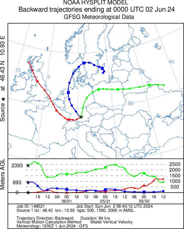 Rückwärtstrajektorien für das Epizentrum Augsburg, Enddatum 02. Juni 2024, 02 Uhr MESZ: