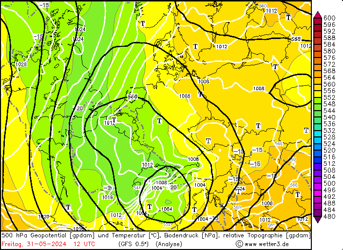 Ein ausgeprägter Höhentiefkern sitzt über Oberitalien. Vorderseitig strömen in der Höhe hochlabile Luftmassen um den Alpenbogen herum nach Mitteleuropa. Das zugehörige Bodentief sitzt an der Oberen Adriaküste sowie als Tiefdruckrinne über Tschechien bis Deutschland reichend. Damit herrscht bodennah eine lebhafte Nordwestströmung, mit der die Regengebiete gegen die Alpen gepresst werden, bzw. sich die herumgeführte Okklusionsfront für viele Stunden über Süddeutschland kaum von der Stelle rührt. Wie schon beim Saarland-Hochwasser kommt die bodennahe Luft nicht (nur) von der Adria, sondern (auch) von der Ostsee: