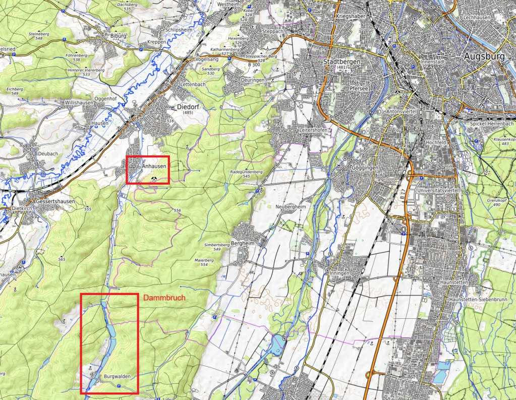 Zuvor trat bereits ein Dammbruch im Ortsteil Anhausen von Diedorf südwestlich von Augsburg auf, der ebenfalls Evakuierungen nach sich zog. Der Anhauser Bach mündet in die Schmutter.