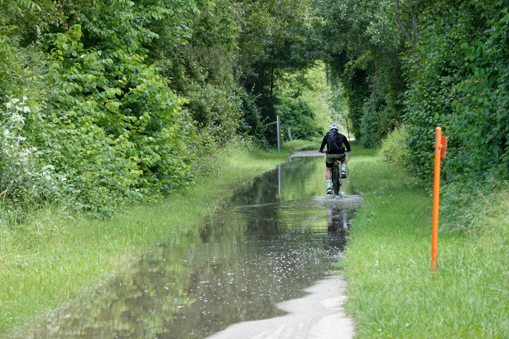 Zu diesem Zeitpunkt konnte man den Radweg gerade so noch befahren, wobei das Wasser an einzelnen Stellen bereits so tief war, dass ich mit den Sandalen beim Treten vollständig eintauchte. In Mannswörth waren die tiefergelegenen Radwegabschnitte bereits gesperrt (Balken unten), konnten aber umfahren werden, ohne auf die Hauptstraße ausweichen zu müssen (habe ich erst beim Rückweg festgestellt).