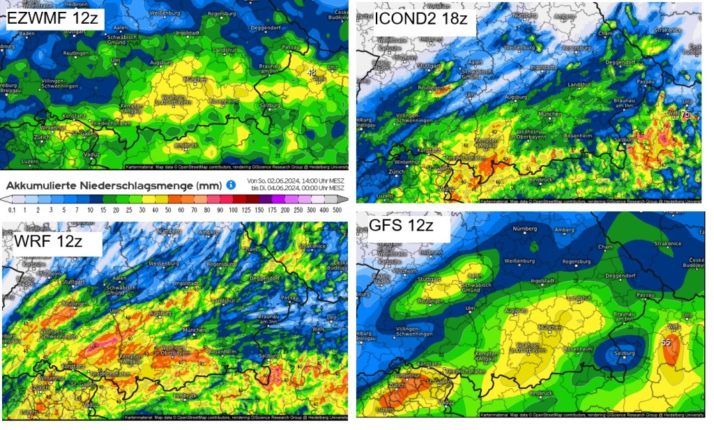 Ebenso wie die Flutkatastrophe in der Eifel am 14.-15. Juli 2021 und das große Hochwasser im Saarland und Rheinland-Pfalz vom 16.-18. Mai 2024 hat sich auch das Hochwasserpotential über Süddeutschland vom 30. Mai bis 2. Juni 2024 tagelang abgezeichnet. Die Wettermodelle haben die Niederschlagsmengen eher ein wenig zurückgefahren, unter Vorbehalt, da die konvektive Natur beibehalten wurde. Konvektive Verstärkung sorgt immer für höhere tatsächliche Gesamtmengen als stratiform gerechnete Modellniederschläge. In den Medien wurde auch frühzeitig getrommelt und von einem möglichen Jahrhunderthochwasser gesprochen. Durch rechtzeitige Vorbereitungen konnte (Stand 02. Juni 2024) eine hohe zivile Opferzahl vermieden werden.
