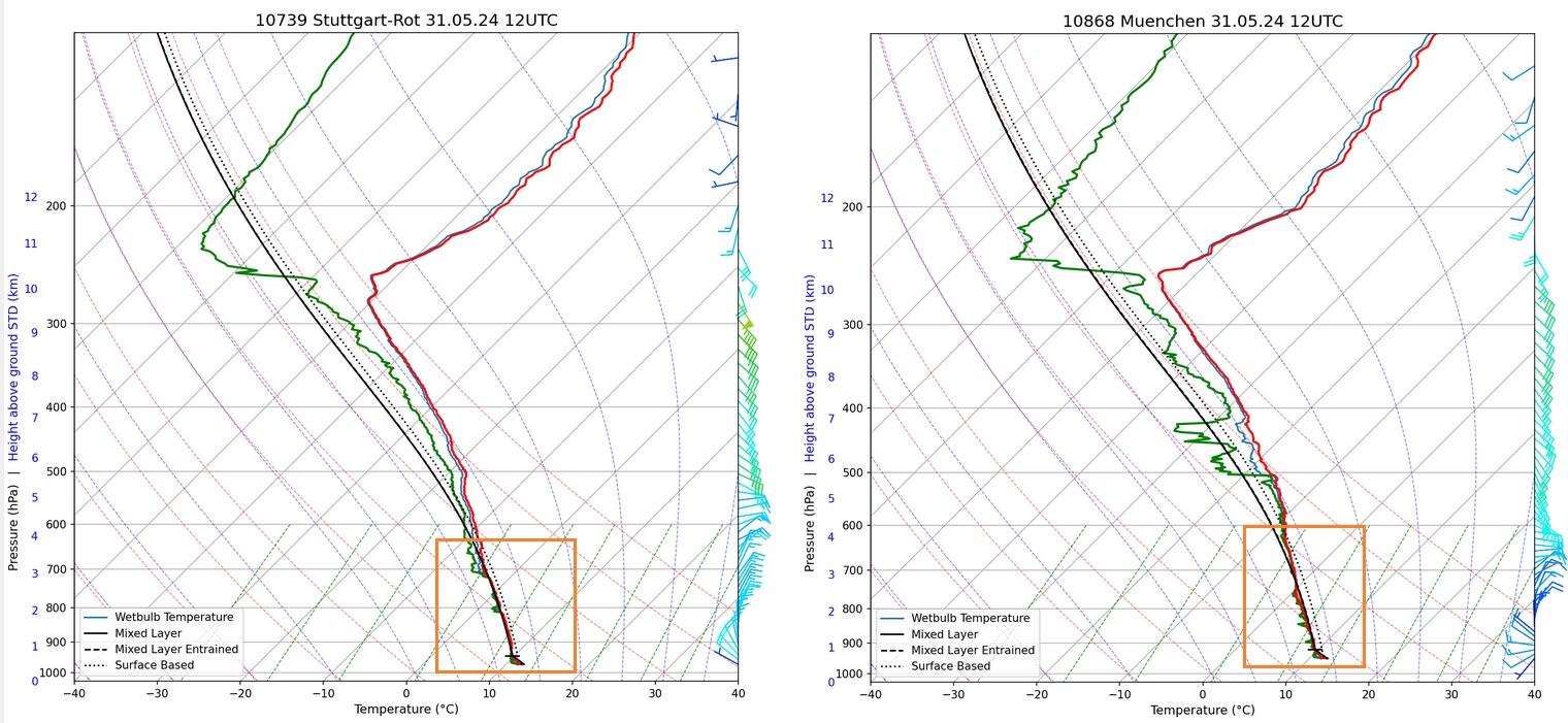 Radiosondenaufstieg Stuttgart und München, jeweils 31. Mai 2024, 14 Uhr MESZ: