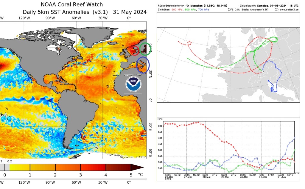Links die Abweichungen der Meeresoberflächentemperatur im Nordatlantik am Vortag, rechts die Herkunft der Luftmasse ab 26. Mai. Blau und grün war immer bodennah und wurde erst am Enddatum angehoben, sie stammten von der Oberen Adria bzw. Ostsee und Nordatlantik. Rot sank die Luftmasse vom Atlantik her ab und drehte sich dann um den Höhentiefkern ein. Es bleibt festzuhalten, dass teilweise Luftmassen von der deutlich zu warmen Ostsee einbezogen wurden. Pro Grad Erwärmung der Luftmasse kann die Luft 7% mehr Wasserdampf aufnehmen.