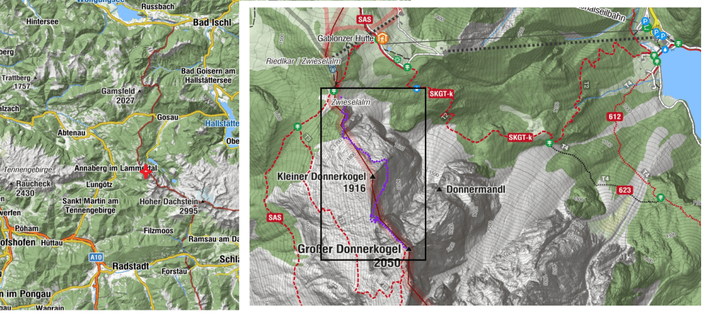 Wie man dem Steigverlauf entnehmen kann, hält er sich im ersten Teil an der Ostseite des Kleinen Donnerkogels (1916m) und somit völlig ohne Sicht nach Westen. Ins Gewitter kamen sie dann in der Scharte unterhalb der Himmelsleiter – wo es bereits zu spät war. Das war so gesehen der vierte Fehler – eine Kletterroute ohne freie Sicht in jene Richtung zu nehmen, aus der die Gewitter aufziehen würden, und das ist in Mitteleuropa nun mal in der Mehrzahl der Fälle der Westen.