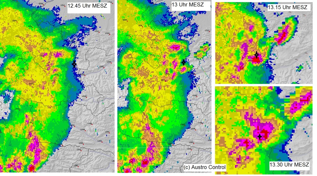 Zwischen 12 und 13 Uhr entstanden dann im großflächigen Niederschlagsbereich an der Vorderkante neue, kräftige Gewitterzellen. Um 13.15 Uhr muss das Gewitter schon über ihnen gewesen sein, um 13.30 Uhr, als sie „vom Gewitter überrascht“ wurden, waren sie schon mittendrin.