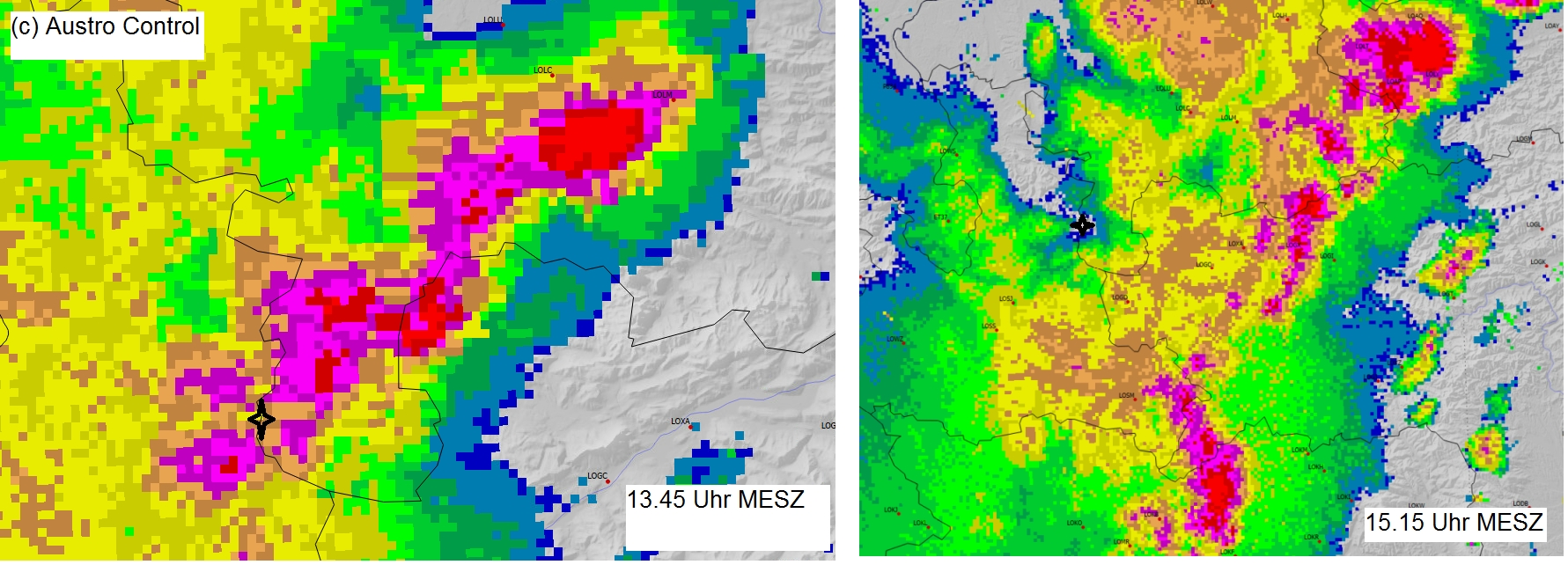 In den Satellitenbildern sieht man bereits um 12 Uhr, wie der weit ausladende Amboss-Cirrusschirm das Dachsteingebiet überdeckt. Um 13 Uhr, also noch rund eine halbe Stunde vor der angeblichen „Überraschung“ sollte auch die tiefe Bewölkung aufgezogen sein. Um 14 Uhr waren sie bereits an der Rückseite der Gewitterlinie, aber noch inmitten der großräumigen-Clusterlinie, weswegen der Hubschrauber nicht starten konnte. Auch für die Bergretter eine lebensgefährliche Situation bei der enormen Blitzdichte.