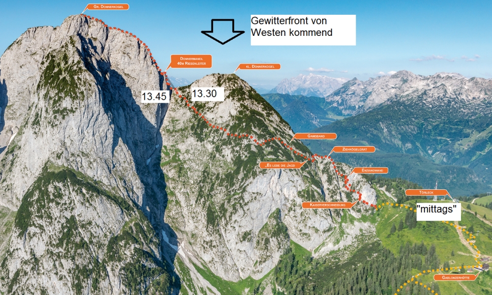 Wie man dem Steigverlauf entnehmen kann, hält er sich im ersten Teil an der Ostseite des Kleinen Donnerkogels (1916m) und somit völlig ohne Sicht nach Westen. Ins Gewitter kamen sie dann in der Scharte unterhalb der Himmelsleiter – wo es bereits zu spät war. Das war so gesehen der vierte Fehler – eine Kletterroute ohne freie Sicht in jene Richtung zu nehmen, aus der die Gewitter aufziehen würden, und das ist in Mitteleuropa nun mal in der Mehrzahl der Fälle der Westen.