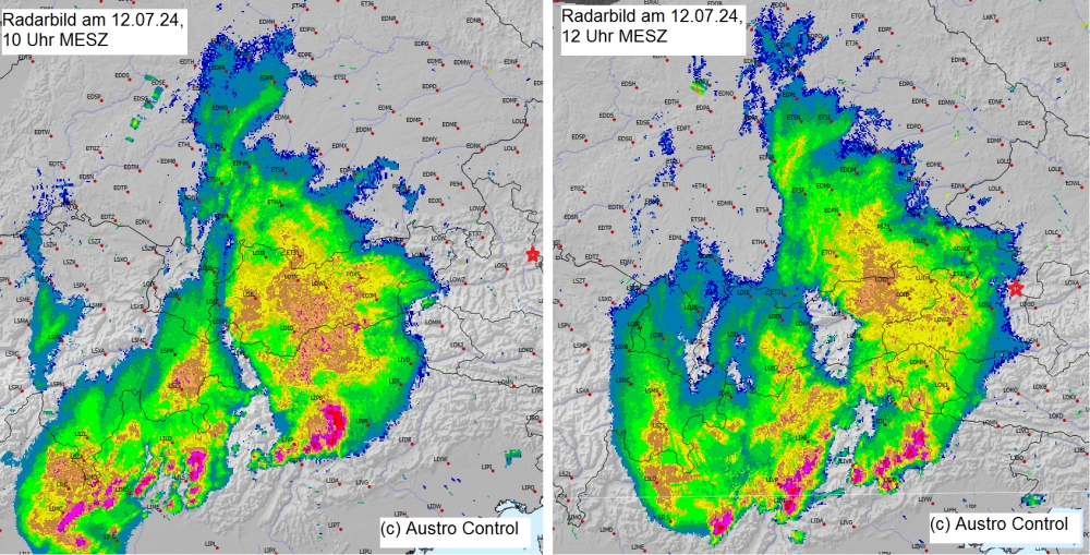 Bereits rund zwei Stunden vor dem Aufbruch (links) auf der Zwieselalm zeigte das Wetterradar mehrere große Gewittercluster mit den stärksten Echos an der Alpensüdseite und einem mäßigen bis starken Niederschlagsbereich an der Alpennordseite. Um den Aufbruch herum setzte schon beinahe der Niederschlag an. Der Himmel wird sich also schon deutlich verfinstert haben.