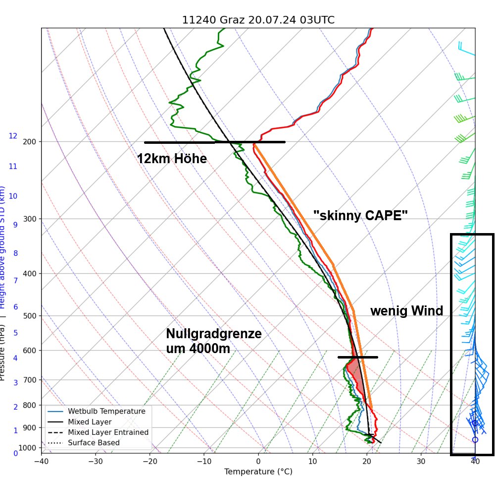 Eine hochreichend feuchte Schicht mit nicht zu viel Labilitätsenergie („skinny CAPE“) unter 1000 J/kg ist für Starkregen günstiger als hohe CAPE-Werte („fat CAPE“), weil dann der Hagelprozess verstärkt wird und Hagel logischerweise nicht in flüssiger Form fällt. Mit „skinny CAPE“ wird man aber keine Gewittertürme von 17km Höhe erreichen.