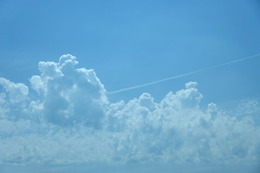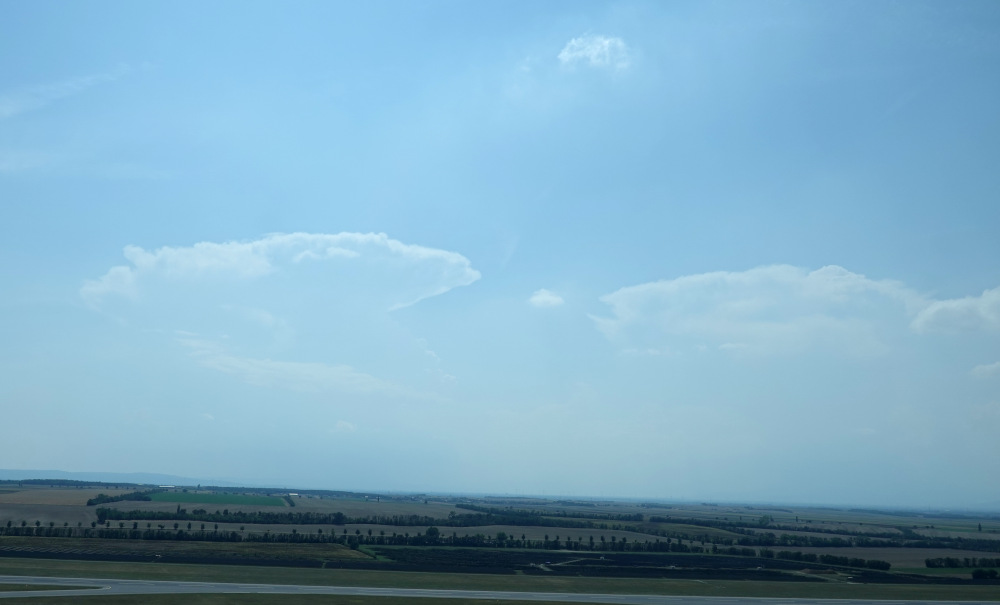 Um die Mittagszeit zwar wolkenlos, was tiefe Bewölkung betraf, aber schon einzelne Altocumulus-Bänke mit verräterischer Vertikalstruktur. Sie deuteten nicht nur auf genügend Feuchte, sondern bereits signifikante Labiltität in mittleren Höhen hin, ein klassischer Gewittervorbote.