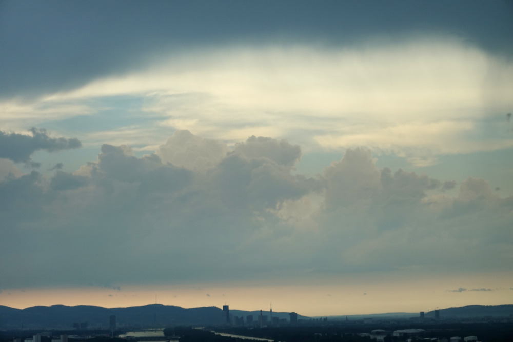 Die frischen Quellungen befanden sich nun westlich vom Wienerwald. Dort gab es weiterhin eine Bodenwindkonvergenz, um einige Kilometer nun verschoben durch das Ausströmen aus dem Wiener Unwetter. Über dem Waldviertel wehte weiterhin Nordwestwind. Über Wien selbst regnete sich der mächtige Ambossschirm des nun zum Multizellencluster verschmolzenen Gewitters langsam ab, aber nurmehr mit schwachen Regenraten.